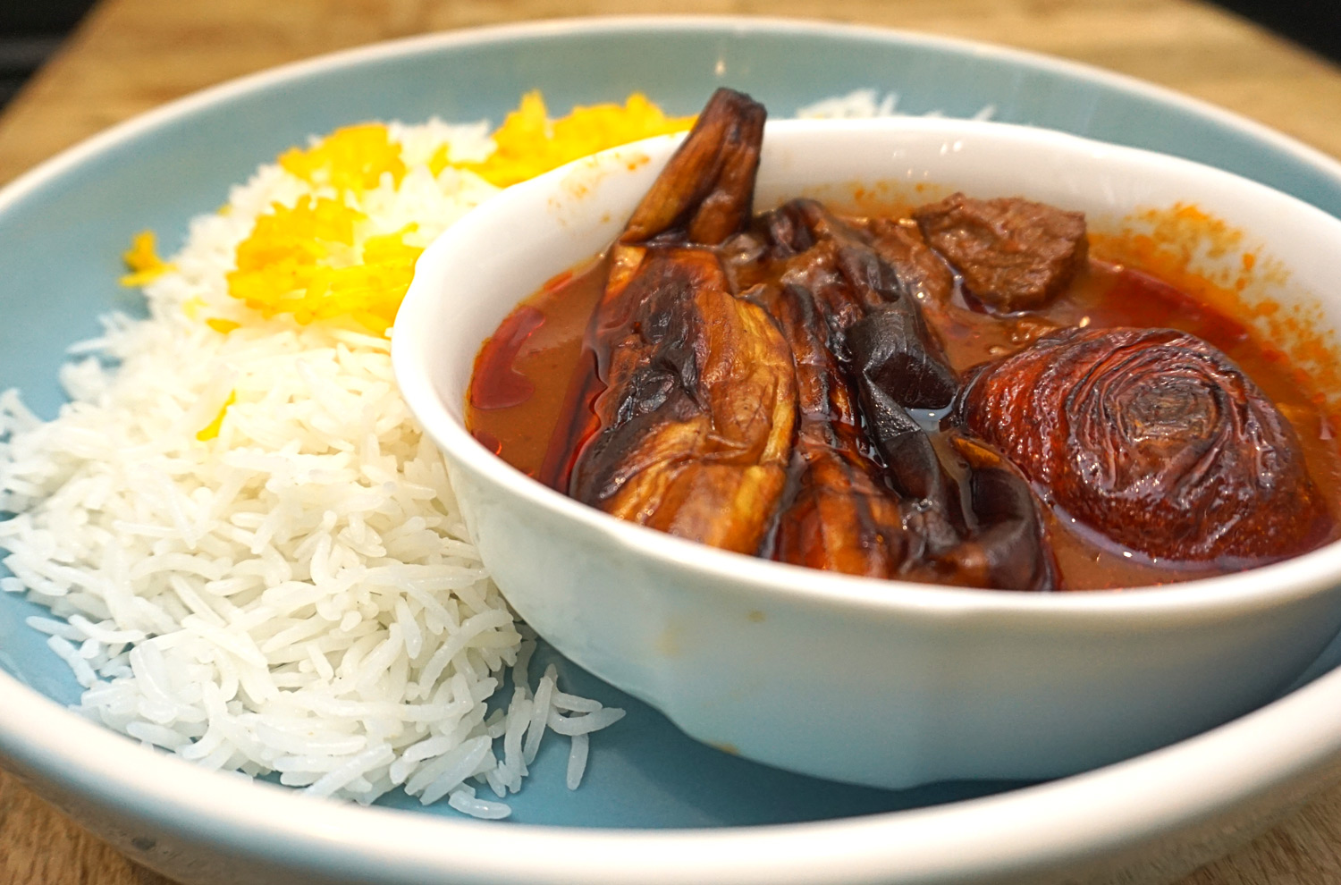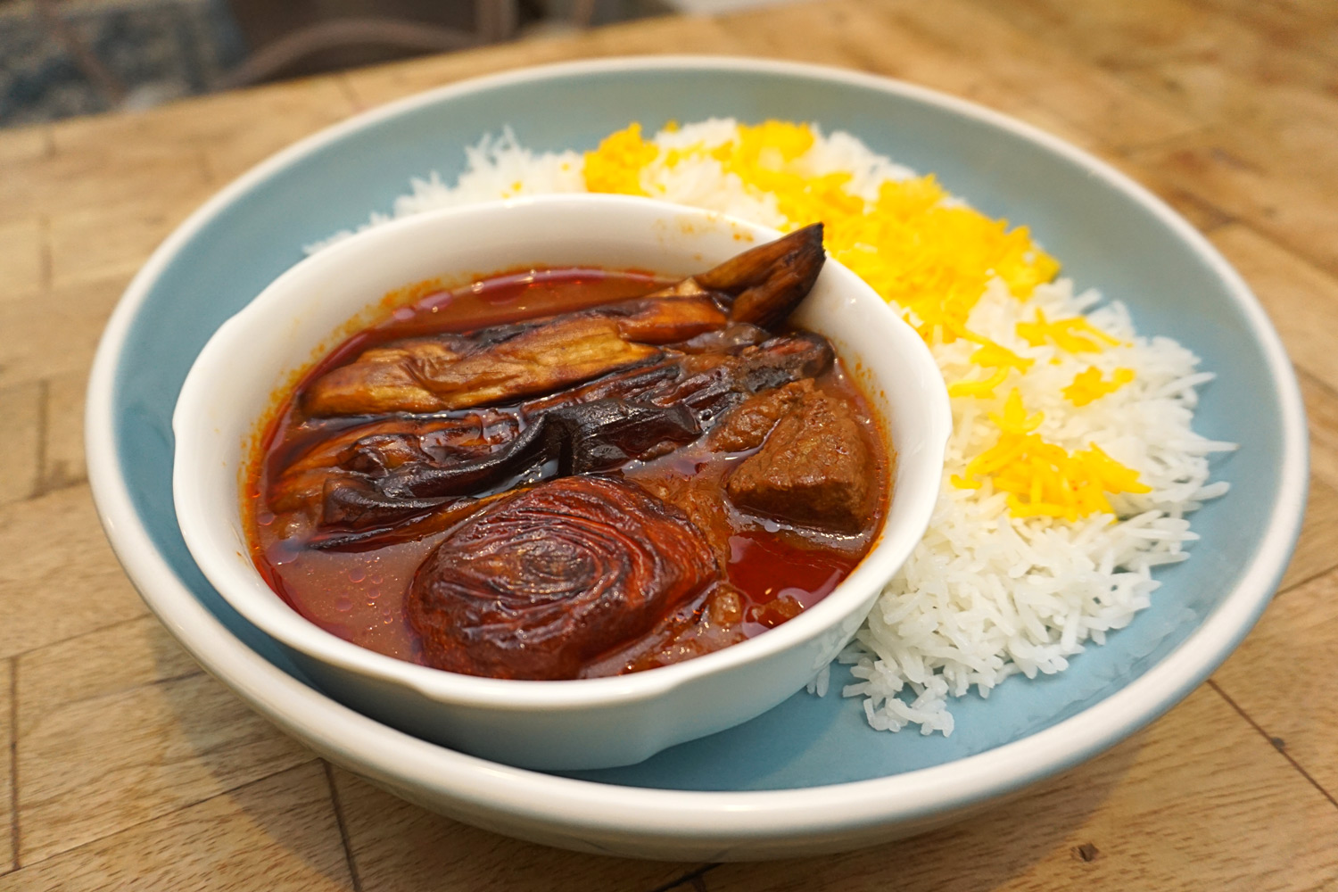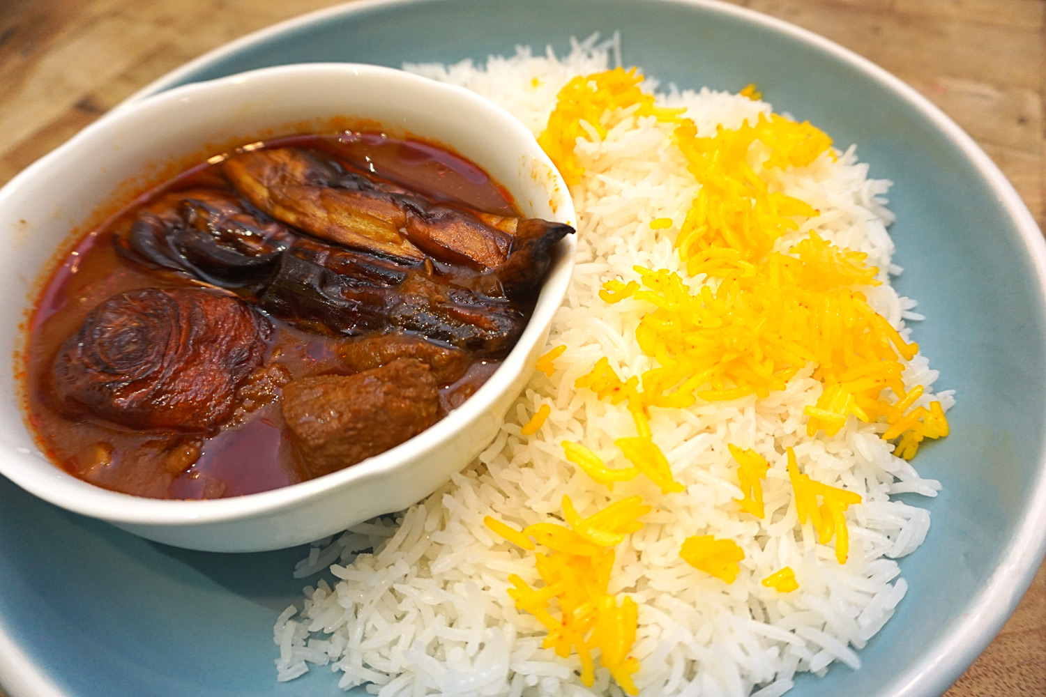 Cooked and Mixed, Chunks of Meat, Processed with Special Spices & Fresh Tomatoes Sauce, Fried Eggplant on the Top of Stew, Served with Basmati Rice and Saffron
