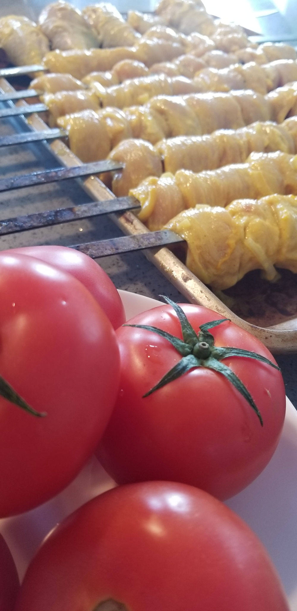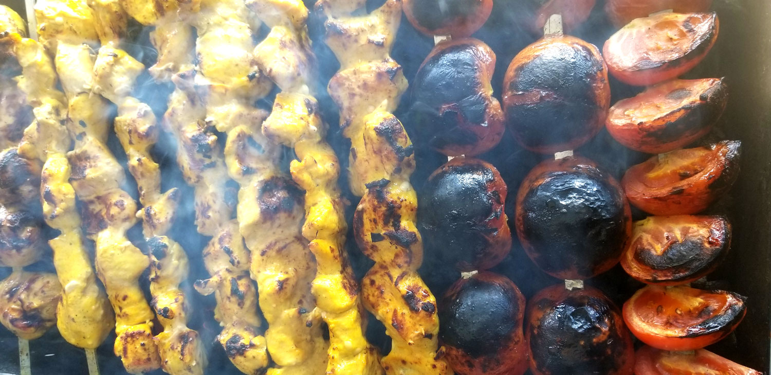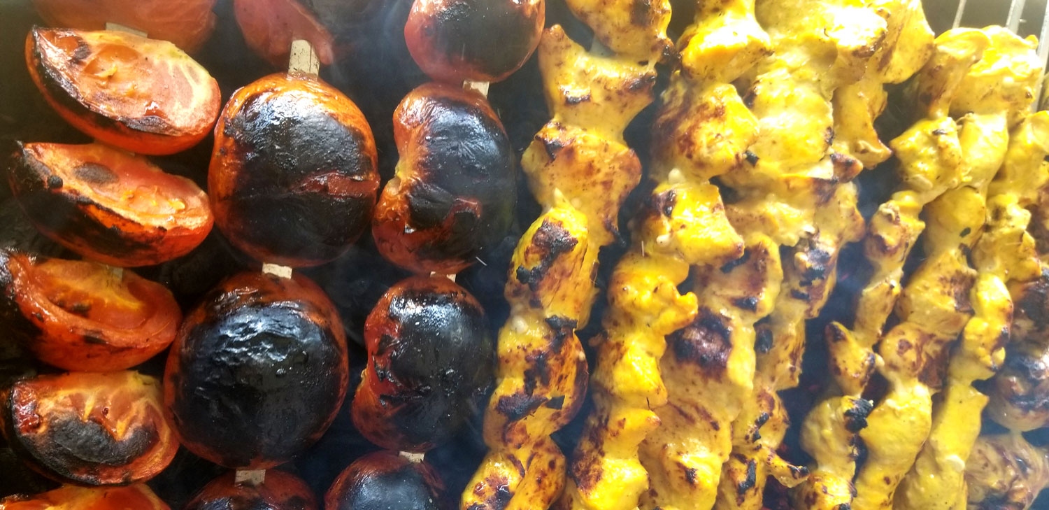One Skewer Grilled Marinated Chicken Breast or chicken legs, Grilled Tomatoes. Served with Basmati Rice and Saffron.