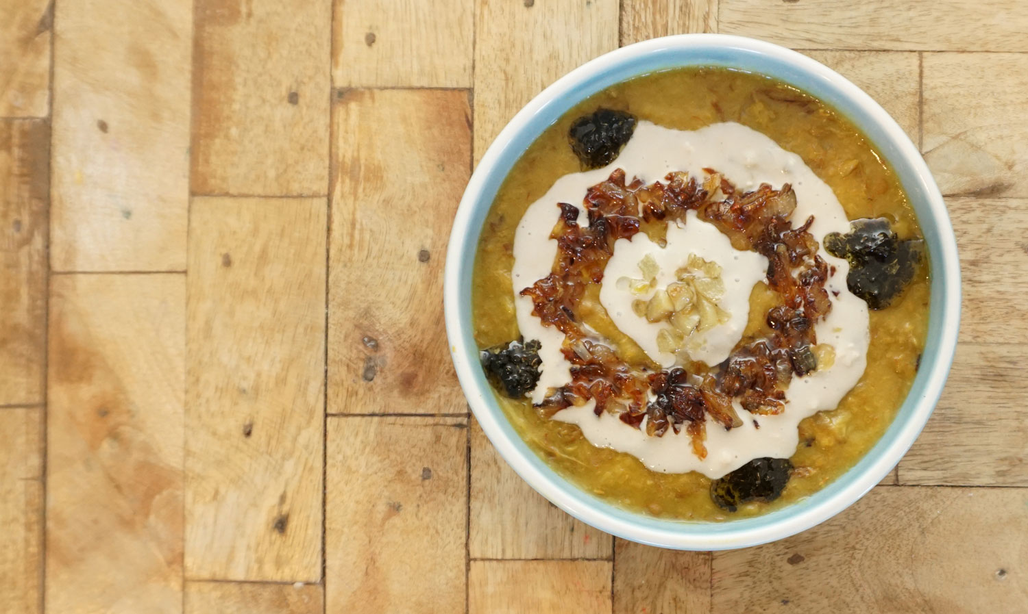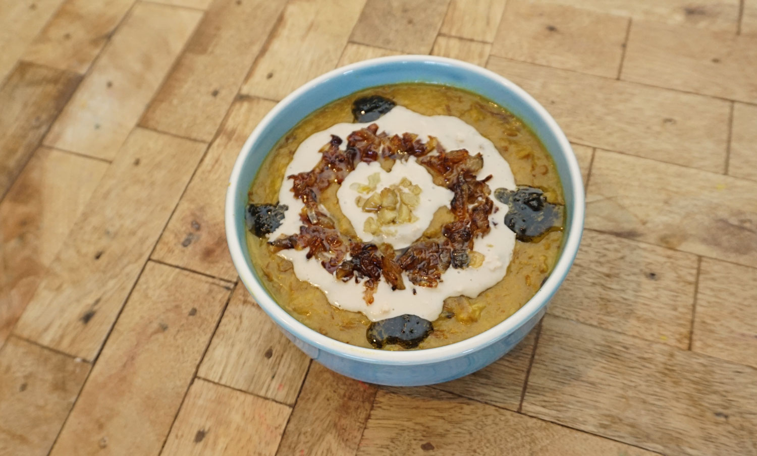Cooked and Mixed and Mashed Beef, Lentils and Jasmine Rice. Fried or Roasted Eggplants and Garlic and kashk. With Fried Onions, Fried Mints and Kashk on top.