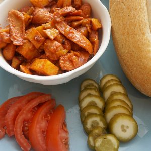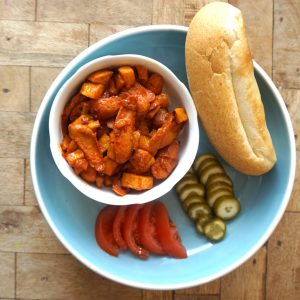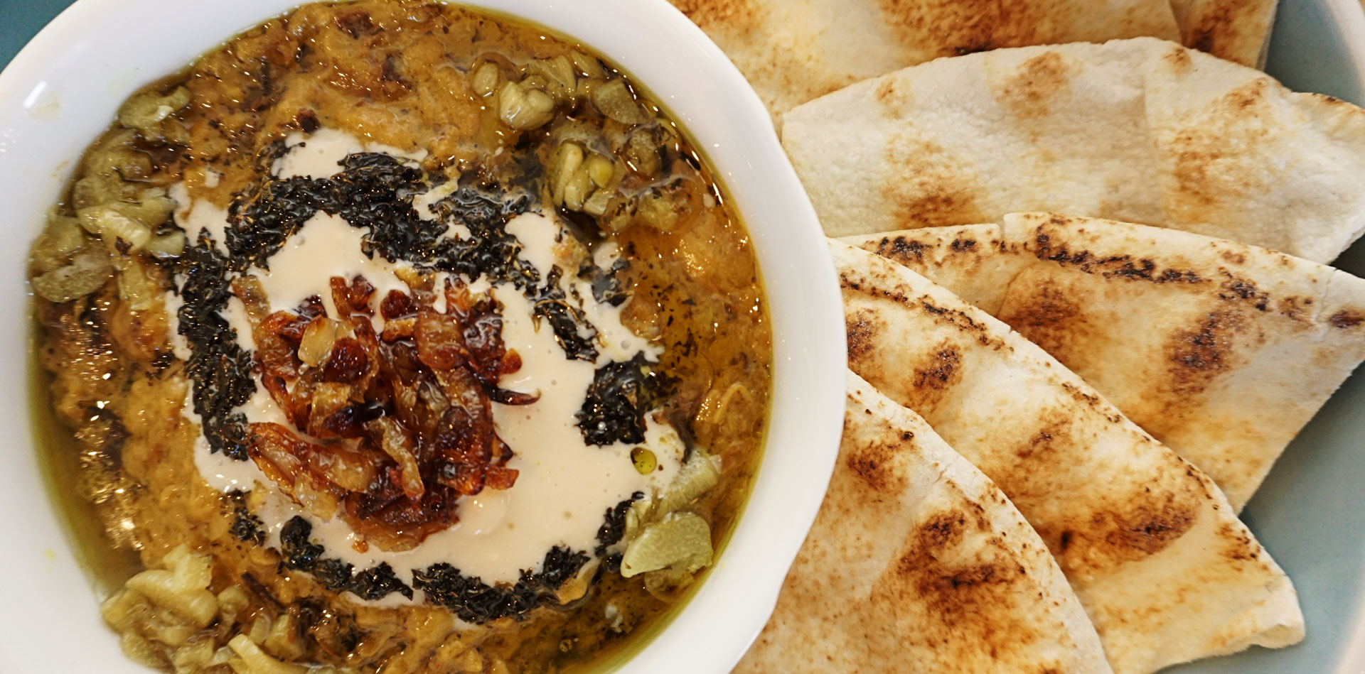 Fried or Roasted Eggplant mixed and Cooked with Fried Onions, Garlic with kashk. with side bread.