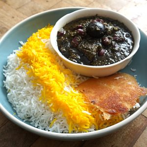 Two Skewered Kabab Koobideh, Grilled Tomatoes. Served with Basmati Rice and Saffron.